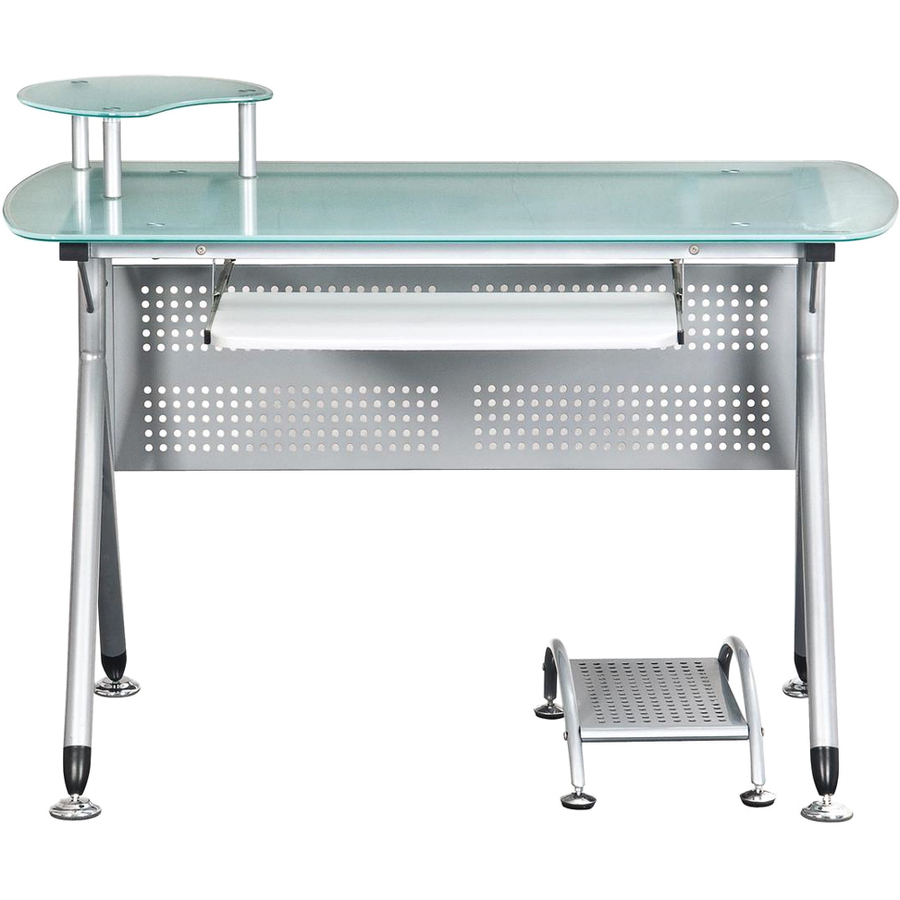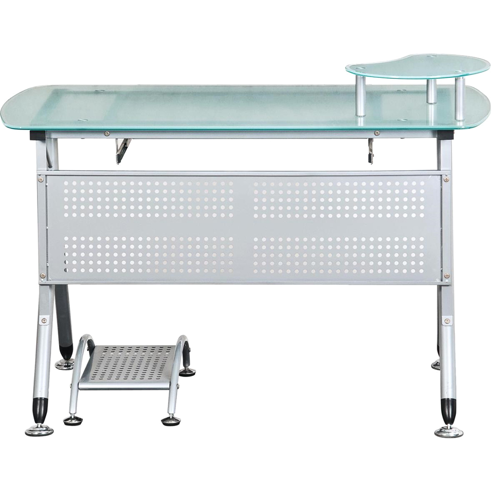 This frosted glass computer desk adds design and style to any home or office room. It offers contoured edges and sleek design steel legs, an optional CPU caddy and an elevated printer or accessory shelf made of tempered glass.